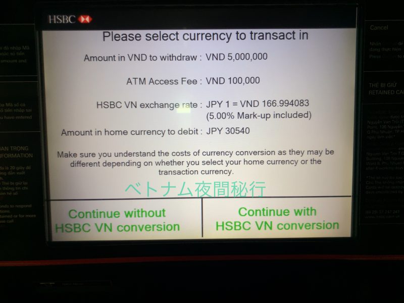 さらに「ATM Access Fee」(ATMオーナー手数料)が「VND100,000」請求されるとあります。
