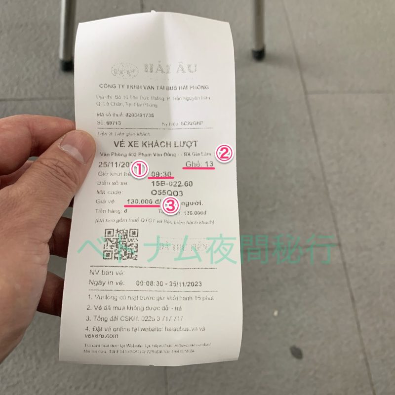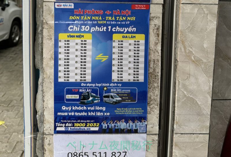 左の「VINH NIEM」というのがハイフォンのバスターミナルのことで、そこを出発する時間を示しています。